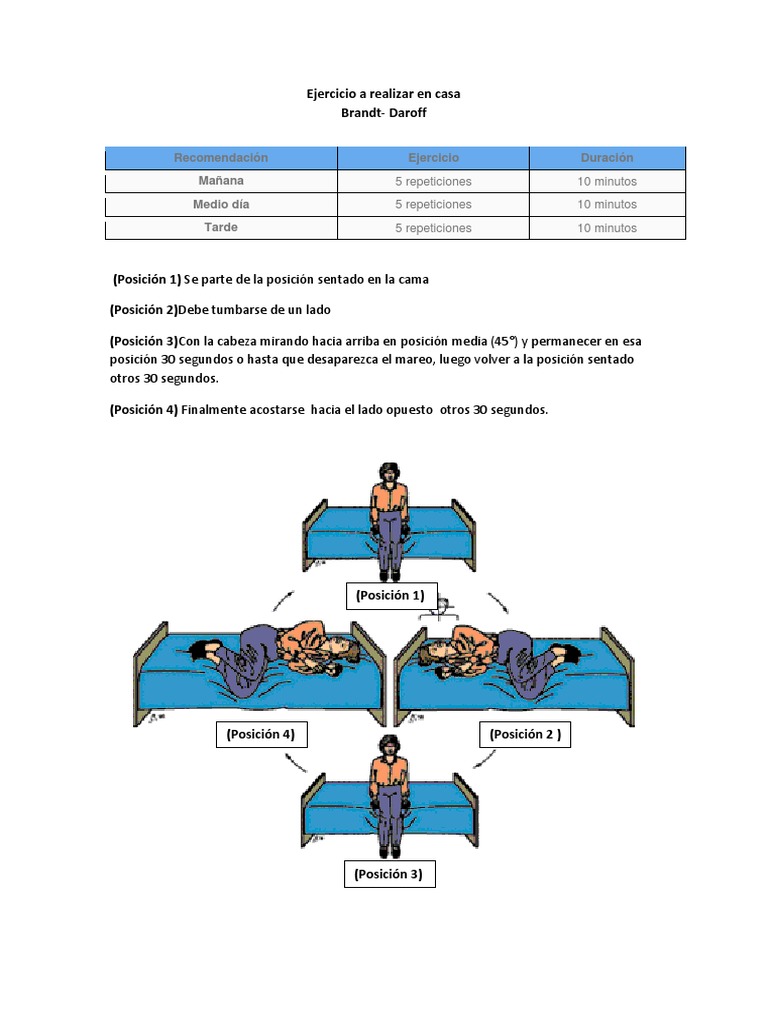 The Brandt-Daroff exercise is one of several exercises that can speed up the compensation process and end the symptoms of vertigo. Follow these steps to try Brandt-Daroff exercises: Sit in the middle of a bed with your feet on the floor. the exercises but the exercises have a good success rate. To do the Brandt-Daroff exercises, follow these steps: Start by sitting down on the edge of a couch or a bed.